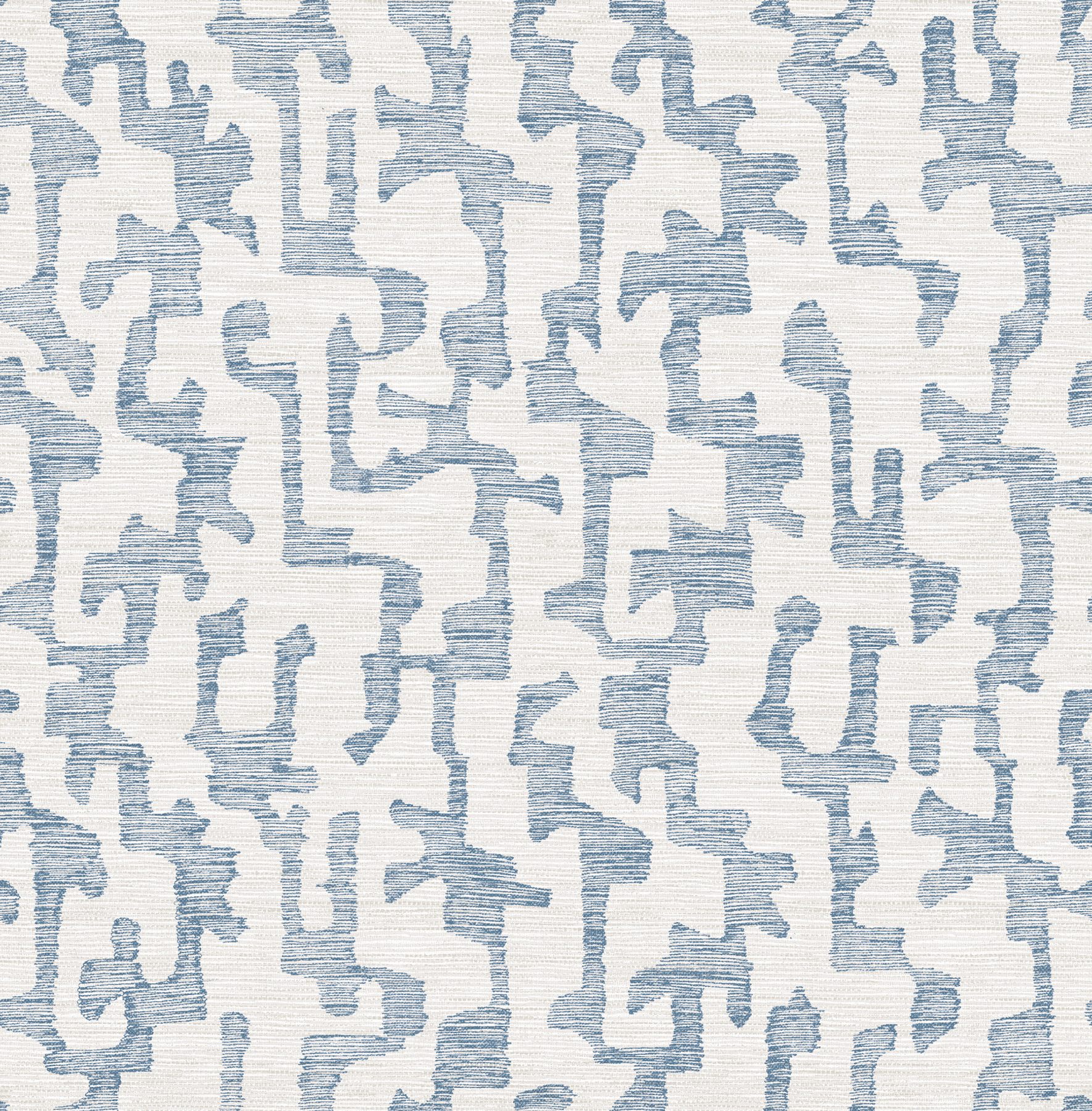 Faux grasscloth detailing adds depth and elegance to Cipher’s abstracted and maze-like forms. Featured here with blue shapes against a light grey backdrop. Cipher is an unpasted, non woven wallpaper measuring 20.5 inches wide by 33 feet long, covering approximately 56.4 square feet per roll.