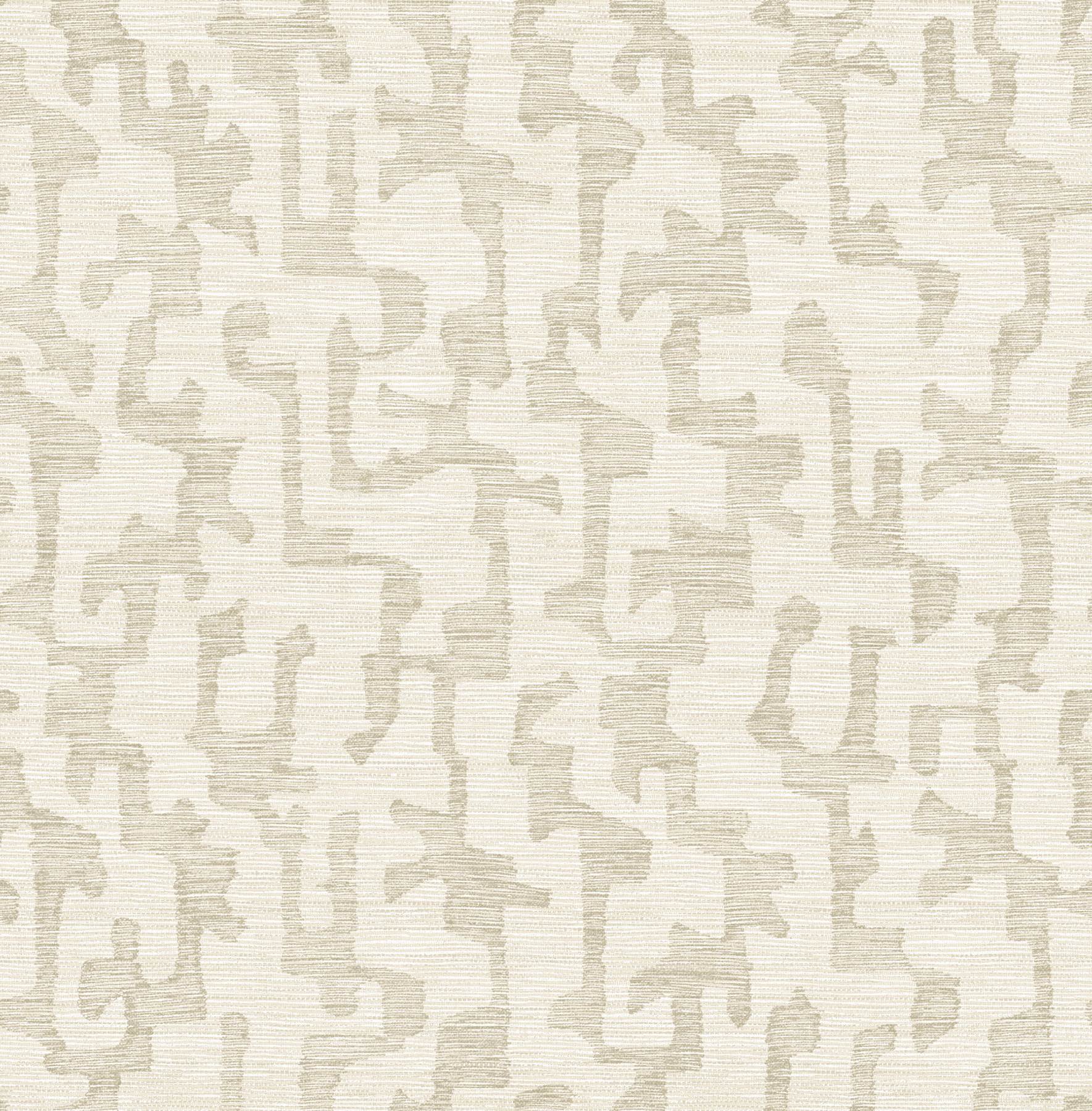 Faux grasscloth detailing adds depth and elegance to Cipher’s abstracted and maze-like forms. Featured here with golden beige shapes against a cream backdrop. Cipher is an unpasted, non-woven wallpaper measuring 20.5 inches wide by 33 feet long, covering approximately 56.4 square feet per roll.