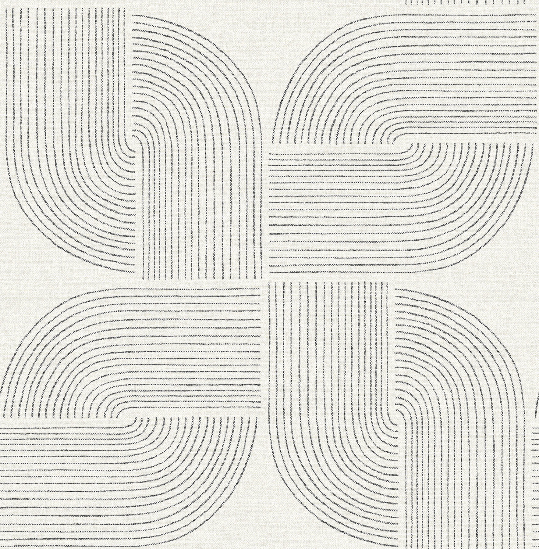 The culmination of linear arches and the stars formed at their center lends Savoye retro flair and lived-in elegance. Featured here with black linework against grey. Savoye is an unpasted, non-woven wallpaper measuring 20.5 inches wide by 33 feet long, covering approximately 56.4 square feet per roll.