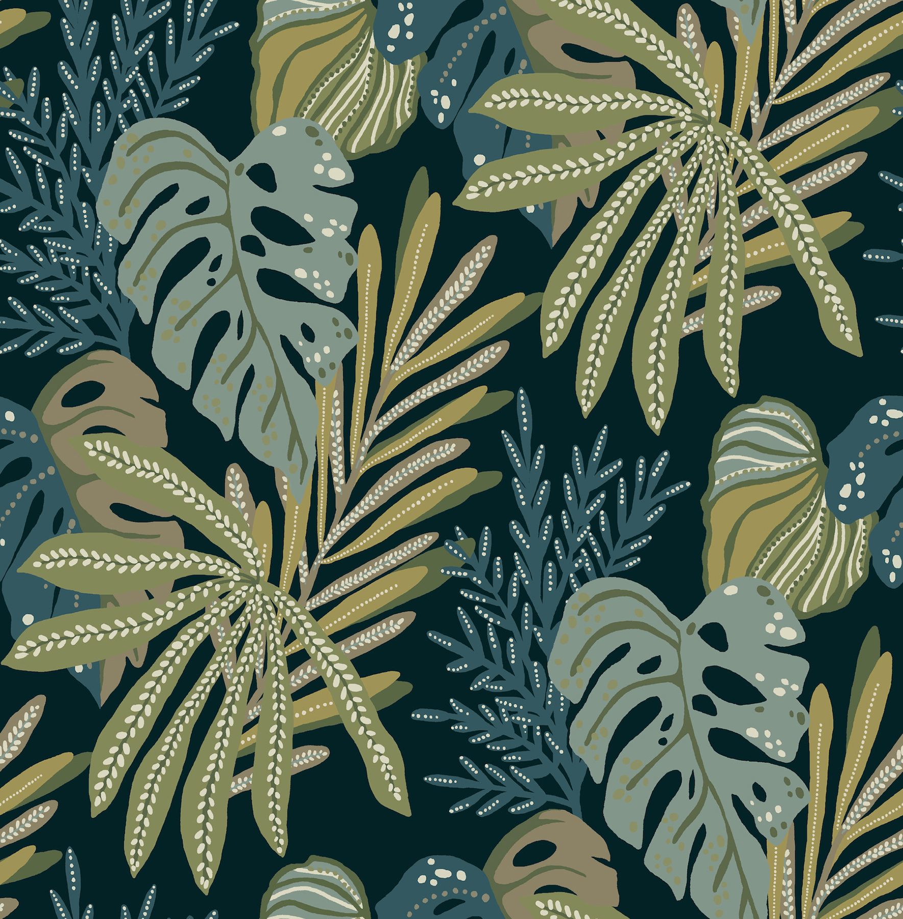 Alocasia’s color-blocked approach to rainforest flora brings added playfulness to this lush tropical design. Seen here in indigo, light blue, lime green, sage, moss, taupe, and white against black. Alocasia is an unpasted, non woven wallpaper measuring 20.5 inches wide by 33 feet long, covering approximately 56.4 square feet per roll.