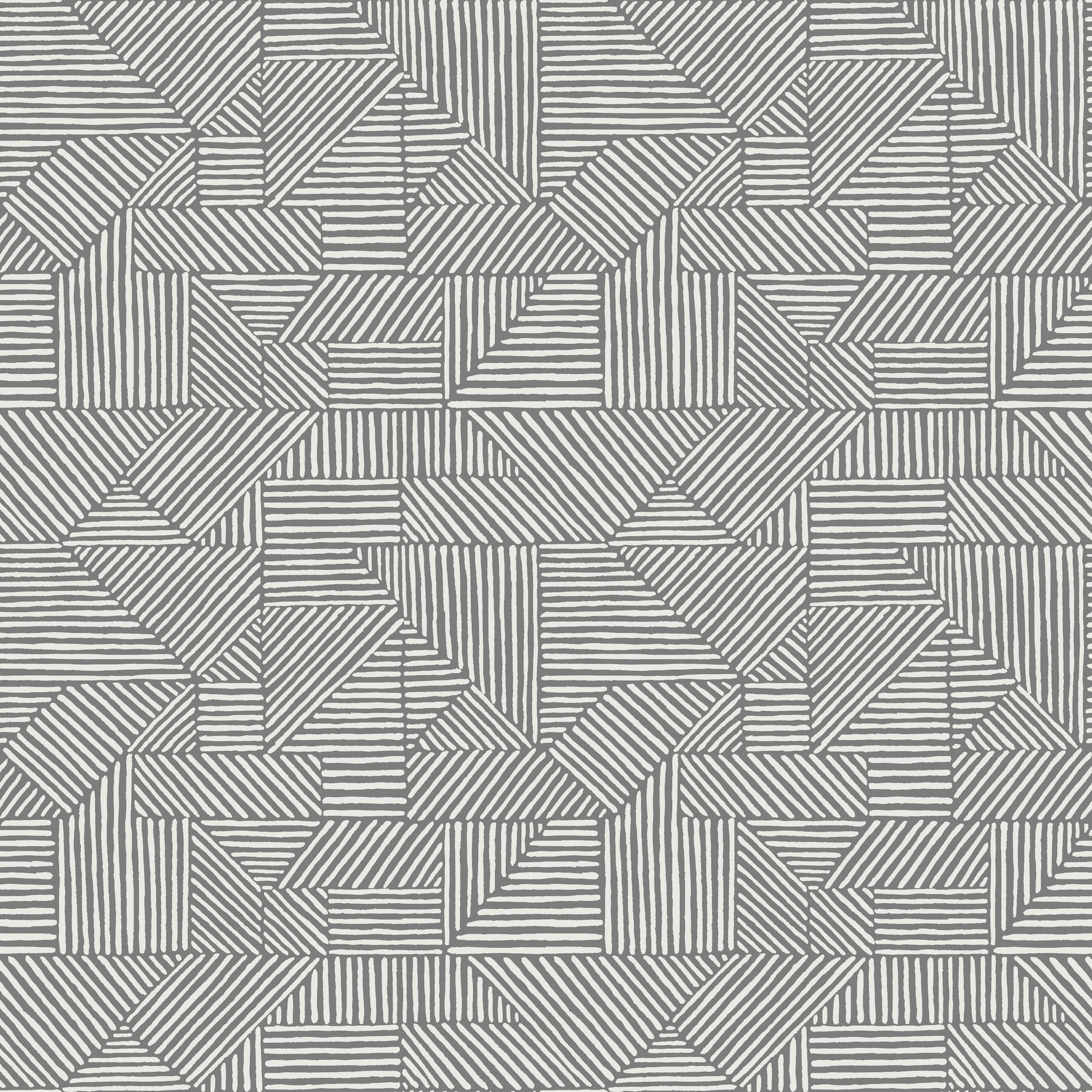 Crescendo’s geometric splendor is built with layers of carved, block-printed forms imbued with ridged tactility. Seen here in light and dark grey. Crescendo is an unpasted, non-woven wallpaper measuring 20.5 inches wide by 33 feet long, covering approximately 56.4 square feet per roll.