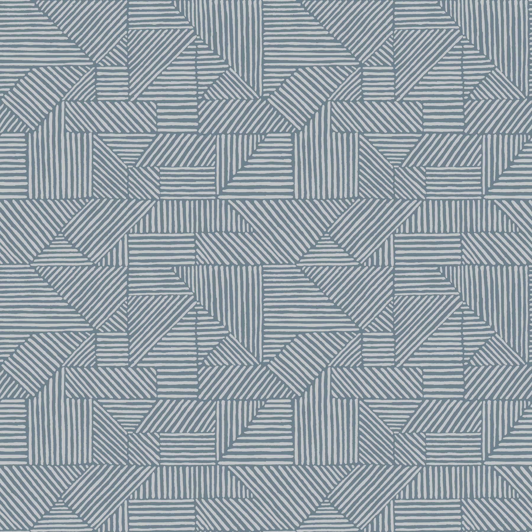 Crescendo’s geometric splendor is built with layers of carved, block-printed forms imbued with ridged tactility. Seen here in blue and pale grey. Crescendo is an unpasted, non-woven wallpaper measuring 20.5 inches wide by 33 feet long, covering approximately 56.4 square feet per roll.