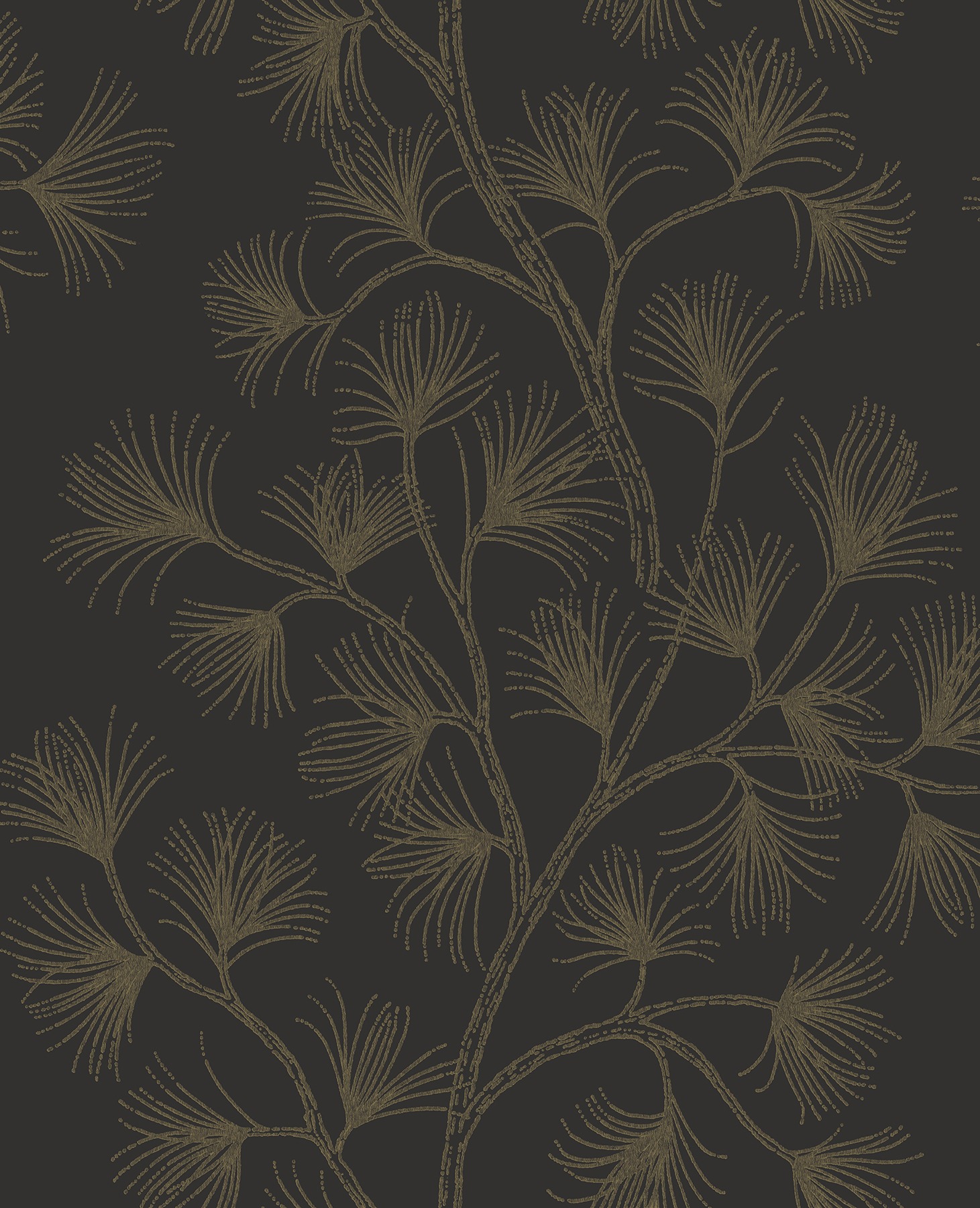 Willowy trees laden with wispy, fan-like leaves offer natural elegance. Detailed in metallic gold and glittering sterling against a black background. Kismine is an unpasted, non woven wallpaper measuring 20.5 inches wide by 33 feet long, covering approximately 56.4 per roll.