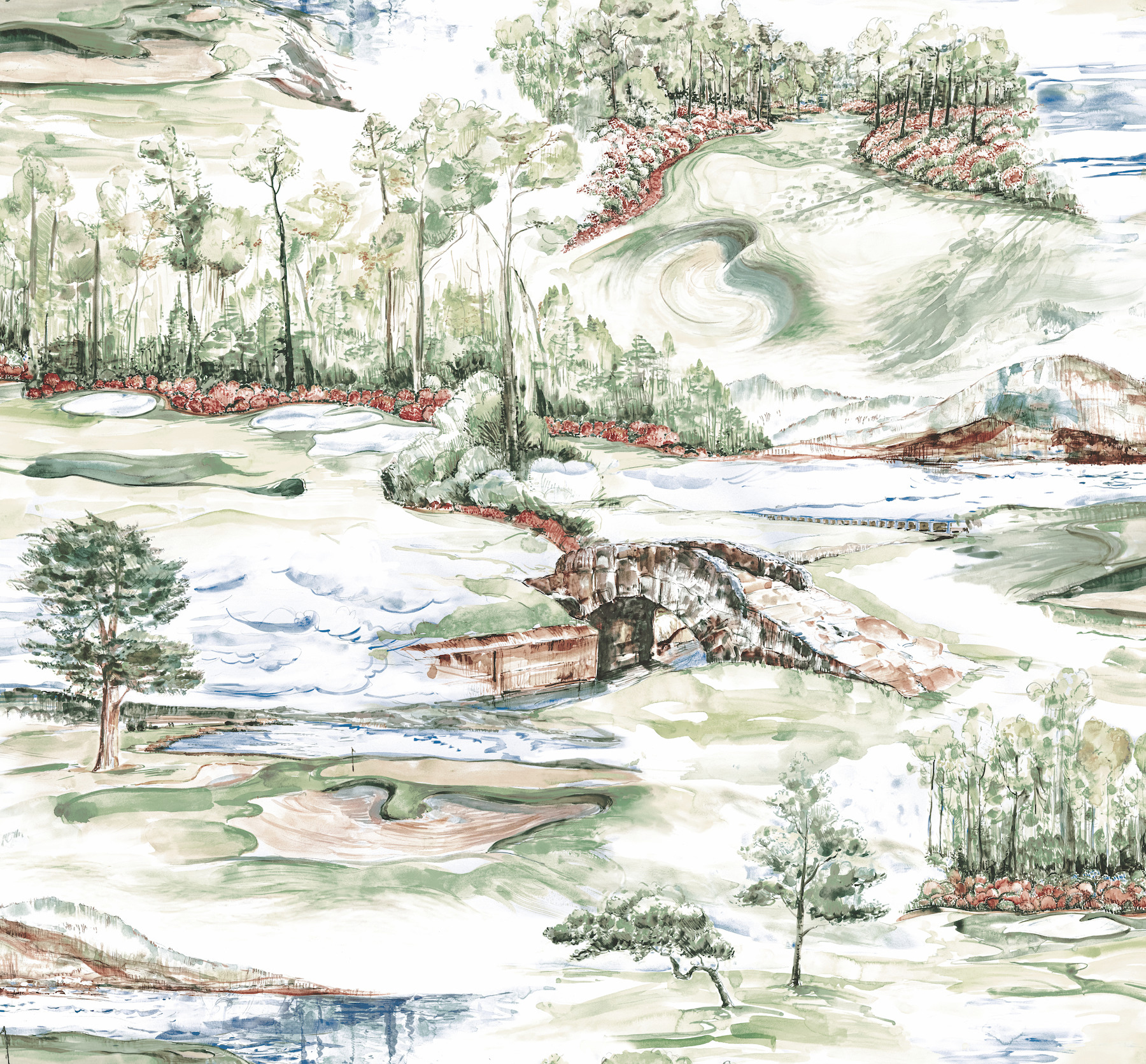 The perfect game of golf awaits at Hole In One's gorgeously illustrated classical course. The variety of holes and surrounding natural scenery are watercolored in shades of green, blue, red, yellow, and brown. Hole In One is an unpasted, non woven wallpaper measuring 33.25 inches wide by 24 feet long, covering approximately 66.5 square feet per roll.