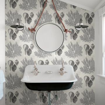 This modern take on traditional coastal design brings a sophisticated beach vibe to your space. The off-white background is layered with lacy coral and spiraled seashells inked in shades of grey and black. Nauset is an unpasted, gravure acrylic coated wallpaper.