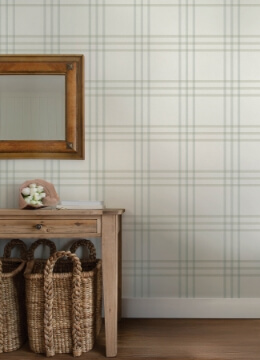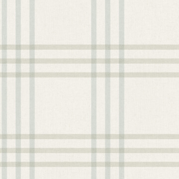 An embellished windowpane plaid, this down-to-earth style features lines in groups of three meeting at perpendicular junctures. The vertical bands are aqua, the horizontal sage, and the backdrop an off-white imbued with linen detailing. Fletcher is a prepasted, Easy-Walls wallpaper measuring 20.5 inches wide by 33 feet long, covering approximately 56.4 per roll.