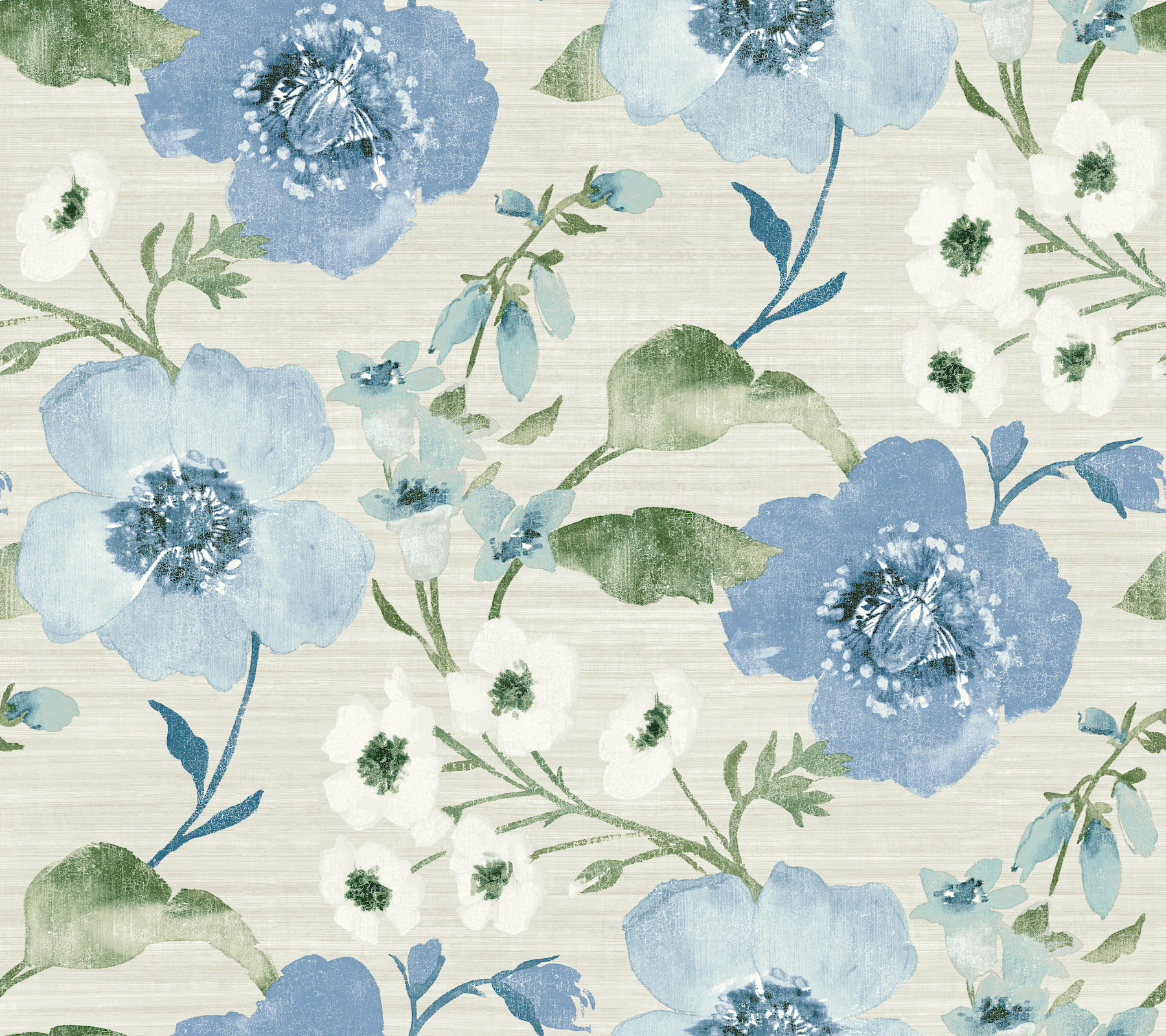 Evelyn's lush, summertime blooms are scattered across a backdrop enriched with variegated striations. Featured here in shades of blue, white, and green against pale grey. Evelyn is an unpasted, non woven wallpaper measuring 27 inches wide by 27 feet long, covering approximately 60.8 square feet per roll.