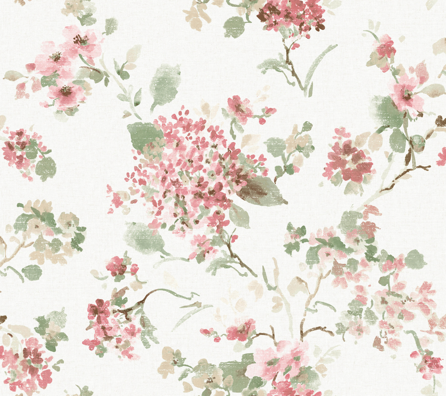 A medley of summertime blooms climb towards the sun in charming Veiled Garden. The flowers are inked in pink, raspberry, beige, spring green, and brown along a white backdrop imbued with linen detailing. Veiled Garden is an unpasted, non woven wallpaper measuring 27 inches wide by 27 feet long, covering approximately 60.8 square feet per roll.