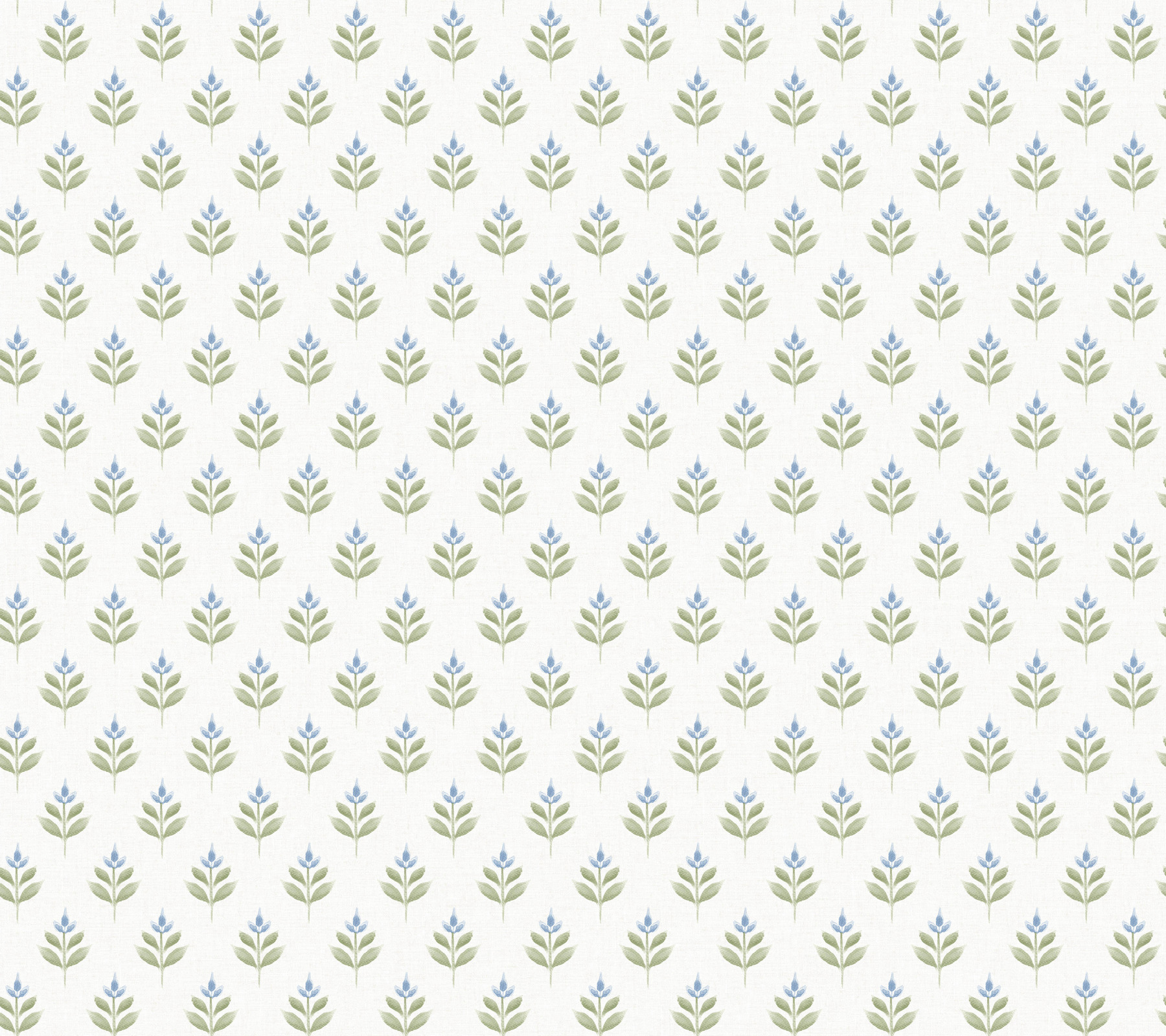 Dainty, abstract tulips are stamped in offset rows along a backdrop imbued with linen detailing in pattern Serene Villa. Seen here in blue and moss green against white. Serene Villa is an unpasted, non woven wallpaper measuring 27 inches wide by 27 feet long, covering approximately 60.8 square feet per roll.