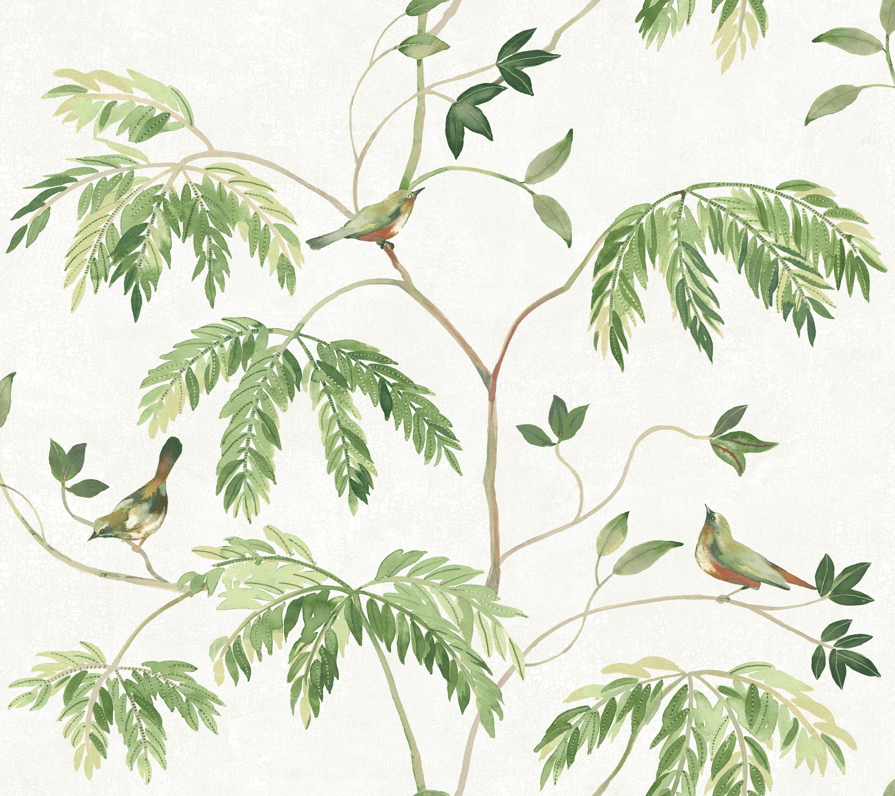 Curious birds perch along spindly saplings, the backdrop's antique and weathered texture giving pattern Cillian depth and comfort. Featured here in shades of vibrant green, red, ochre, and beige against cream. Cillian is an unpasted, non woven wallpaper measuring 27 inches wide by 27 feet long, covering approximately 60.8 square feet per roll.