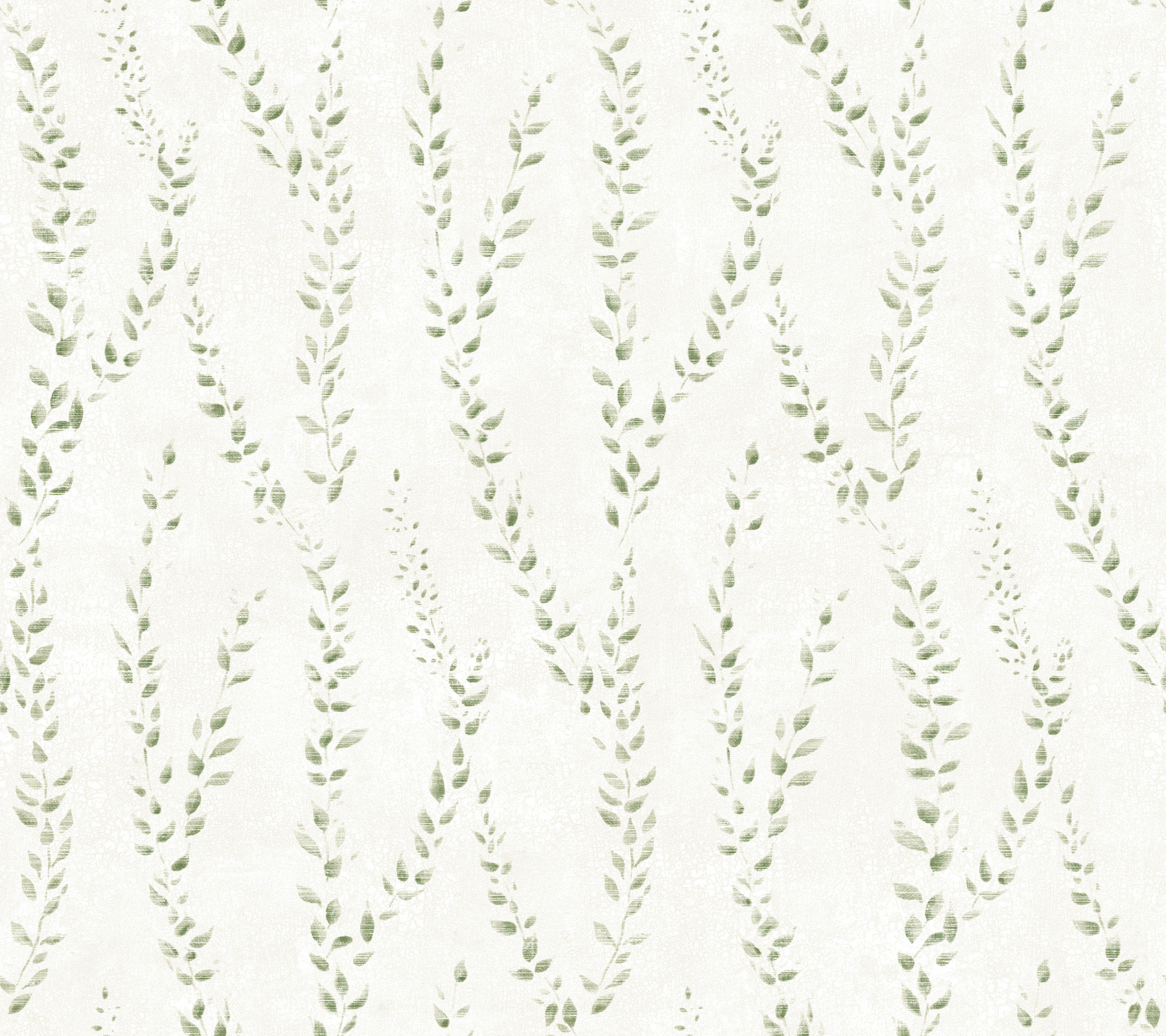 Thin vines with dainty, pointed leaves climb upwards along a weathered backdrop in pattern Alpenrose. Seen here in moss green against cream. Alpenrose is an unpasted, non woven wallpaper measuring 27 inches wide by 27 feet long, covering approximately 60.8 square feet per roll.
