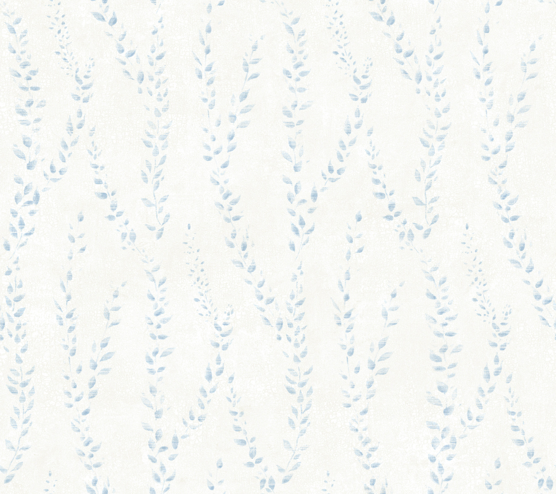 Thin vines with dainty, pointed leaves climb upwards along a weathered backdrop in pattern Alpenrose. Seen here in soft blue against off-white. Alpenrose is an unpasted, non woven wallpaper measuring 27 inches wide by 27 feet long, covering approximately 60.8 square feet per roll.