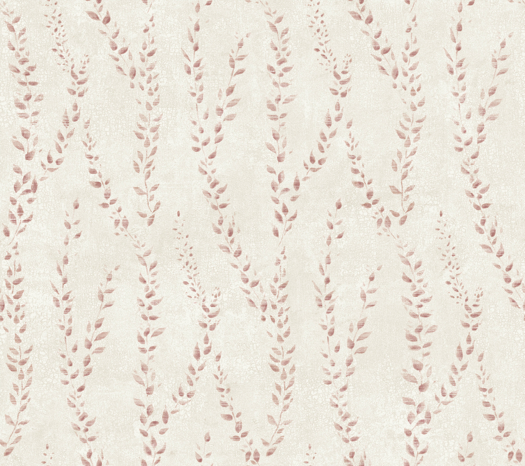 Thin vines with dainty, pointed leaves climb upwards along a weathered backdrop in pattern Alpenrose. Seen here in maroon against beige. Alpenrose is an unpasted, non woven wallpaper measuring 27 inches wide by 27 feet long, covering approximately 60.8 square feet per roll.