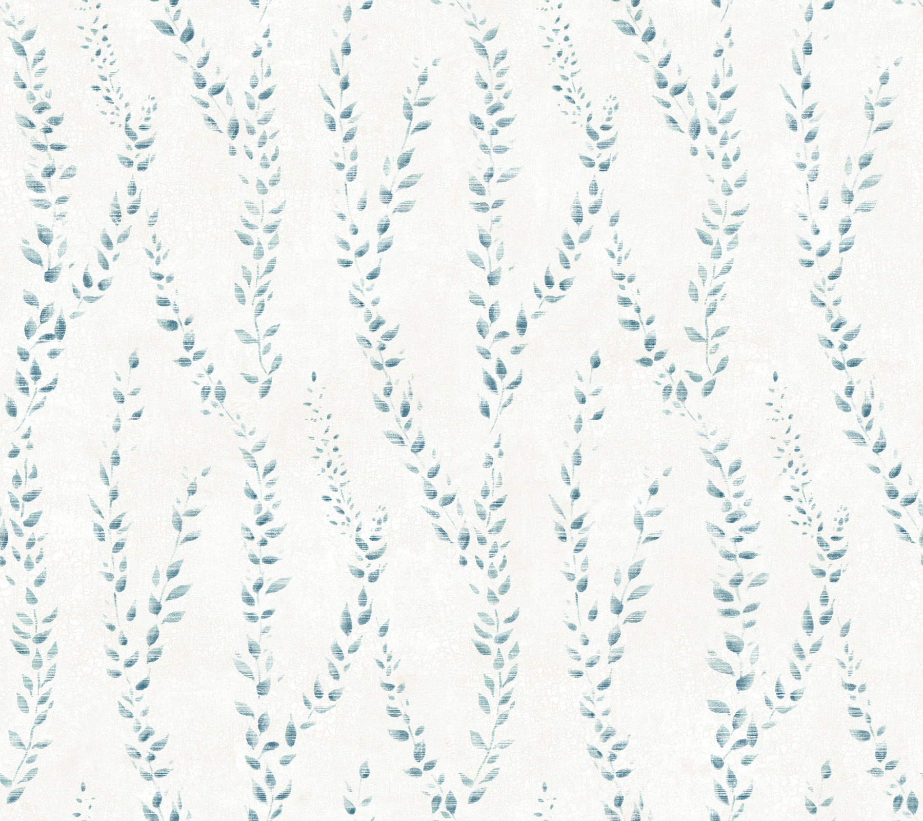 Thin vines with dainty, pointed leaves climb upwards along a weathered backdrop in pattern Alpenrose. Seen here in rich blue against off-white. Alpenrose is an unpasted, non woven wallpaper measuring 27 inches wide by 27 feet long, covering approximately 60.8 square feet per roll.