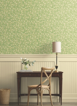 Make a subtle statement with Elodie, a simple yet intricate pattern of petite blooms and swirling vines. Featured here in sage, moss, white, and gold against dark green. Elodie is a peel and stick, non woven wallpaper measuring 27 inches wide by 20 feet long, covering approximately 45 square feet per roll.