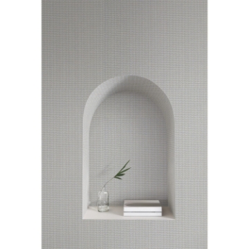 Braided threads cascade downwards in pattern Silk Spun to create a veil of delicate, tactile stripes. Seen here in light grey accented by taupe. Silk Spun is an unpasted, osnaburg vinyl wallpaper measuring 27 inches wide by 27 feet long, covering approximately About 60.8 square feet square feet per roll.