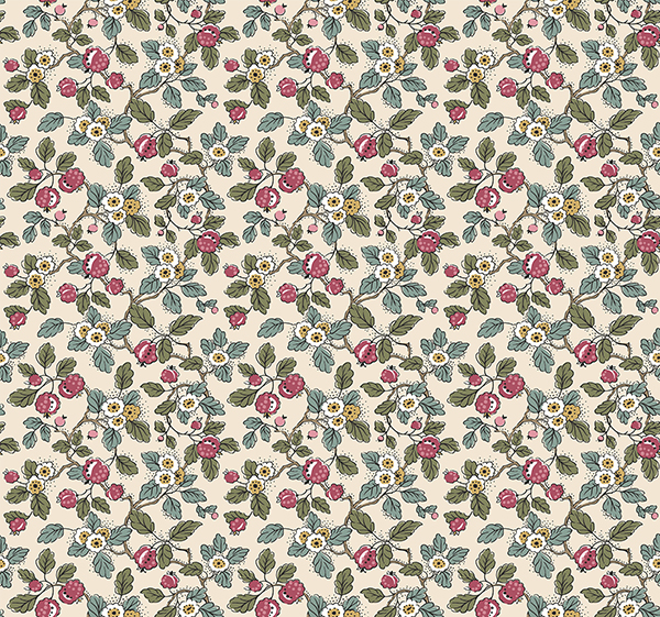 Ripe berries share the vine with floral blooms in the dense greenery of charmingly illustrated pattern Framboise. Featured here with a palette of merlot, light pink, butter yellow, aqua, forest green, brown, and white against cream. Framboise is an unpasted, non woven wallpaper measuring 27 inches wide by 27 feet long, covering approximately 60.8 square feet per roll.