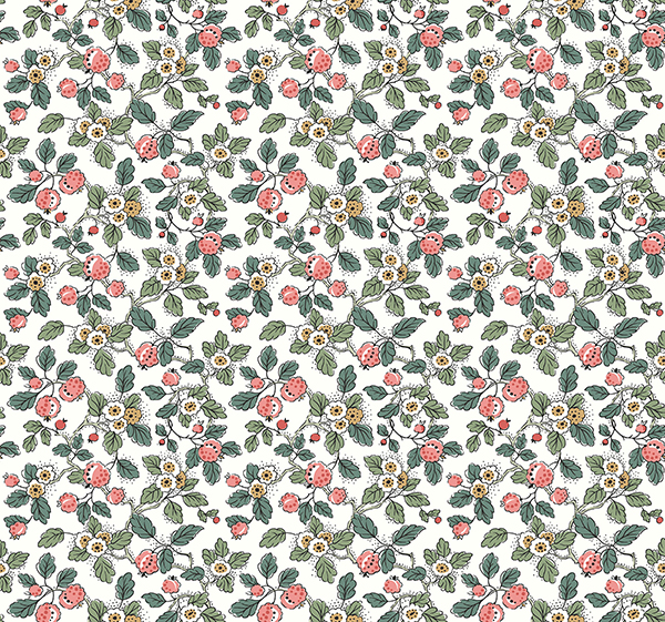 Ripe berries share the vine with floral blooms in the dense greenery of charmingly illustrated pattern Framboise. Featured here with a palette of bright pink, red, light and dark green, bitter yellow, and white. Framboise is an unpasted, non woven wallpaper measuring 27 inches wide by 27 feet long, covering approximately 60.8 square feet per roll.