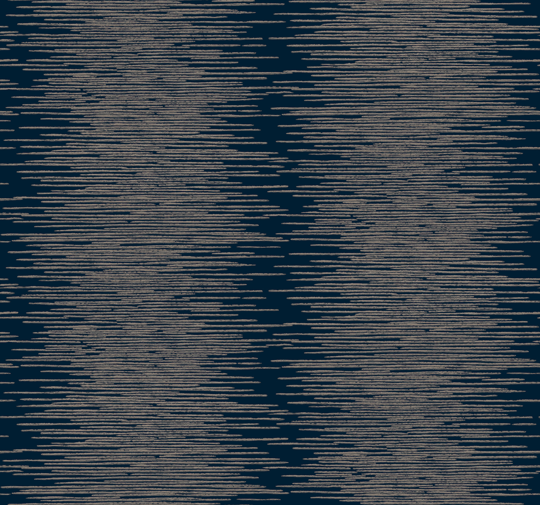 Operetta's organic, jagged columns are formed from dense layers of metallic and colored lines. Seen here in metallic silver, taupe, grey, and brown against navy. Operetta is an unpasted, non woven wallpaper measuring 27 inches wide by 27 feet long, covering about 60.8 square feet per roll.