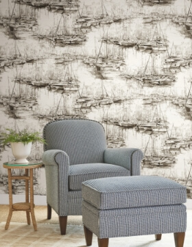 Rows of docked boats stretch as far as the eye can see in pattern Yacht Club's illustrative rendition. Featured here in sepia hues against cream. Yacht Club is an unpasted, non woven wallpaper measuring 27 inches wide by 27 feet long, covering approximately 60.8 square feet per roll.