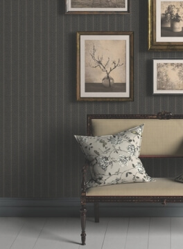 The structure of stripes meets the warmth of woven detailing in pattern Elkan Stripe. The pattern is inked in shades of taupe and grey against a black ground. Elkan Stripe is an unpasted, non woven wallpaper measuring 27 inches wide by 27 feet long, covering approximately 60.8 square feet per roll.