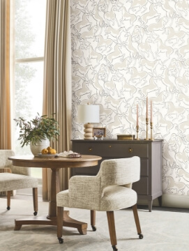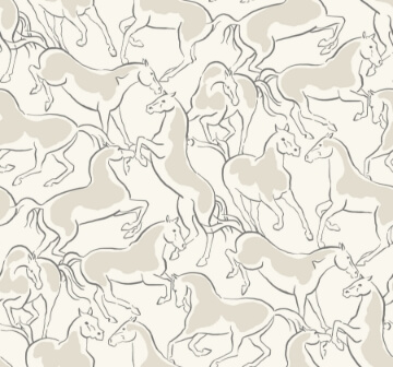 Minimalist renditions of spirited stallions rear and gallop in pattern Dressage. The horses are detailed in golden brown and taupe against a beige backdrop. Dressage is an unpasted, non woven wallpaper measuring 27 inches wide by 27 feet long, covering approximately 60.8 square feet per roll.