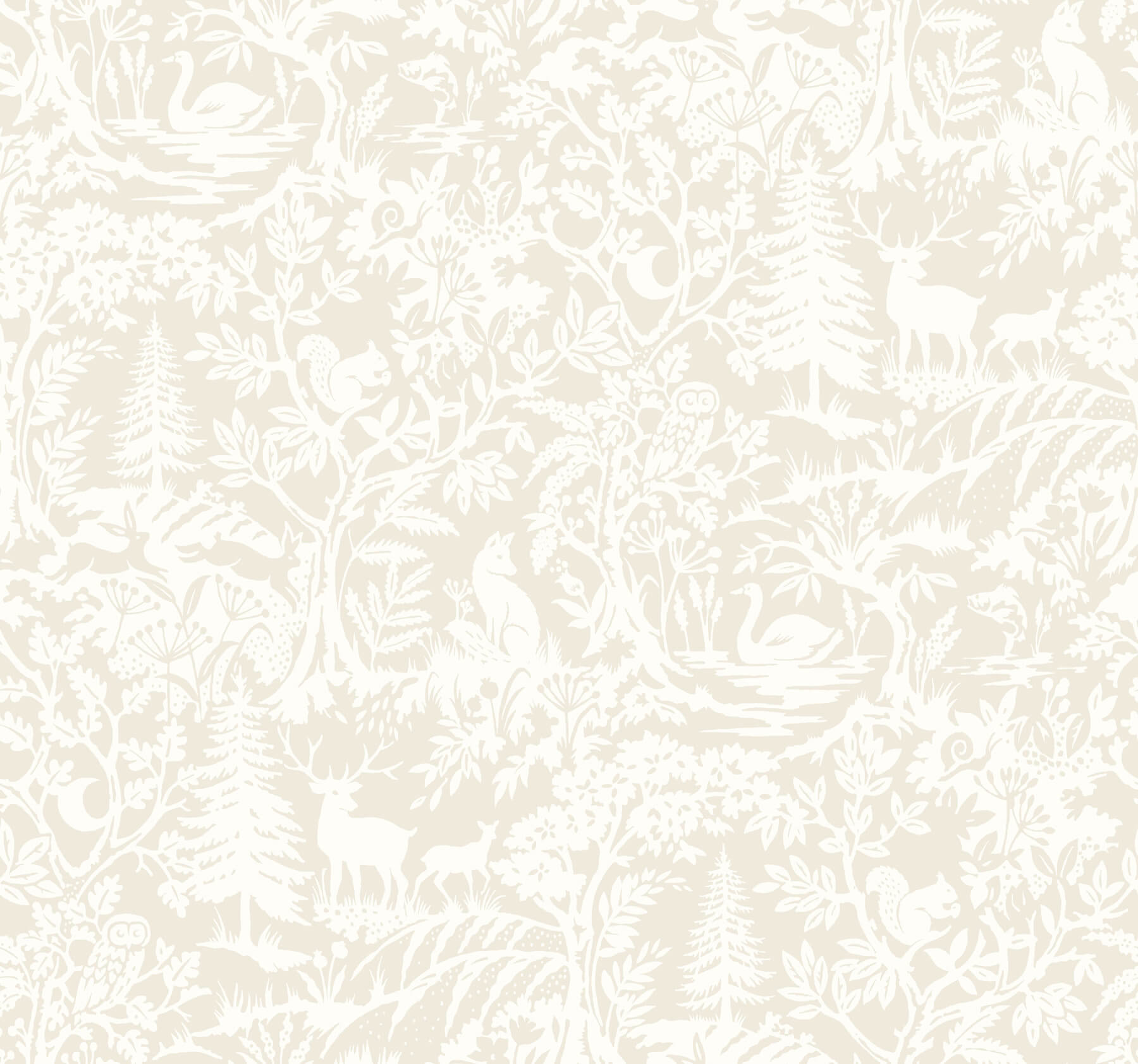 This scenic woodland wallpaper features deer, foxes, rabbits, squirrels and more exploring the forest, the details inked in pale taupe and white. Alrick is a prepasted, sure strip wallpaper measuring 27 inches wide by 27 feet long, covering approximately 60.8 square feet per roll.