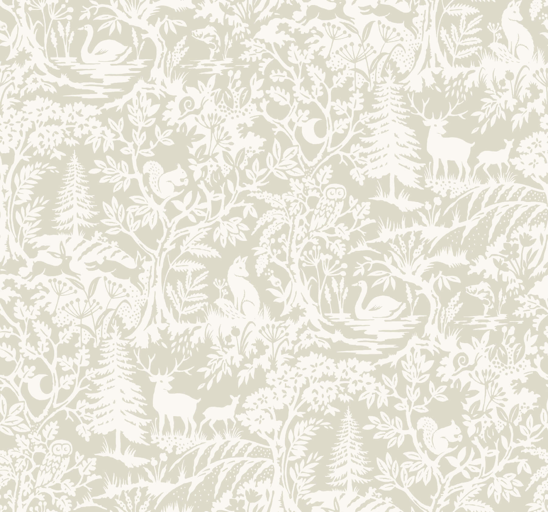 This scenic woodland wallpaper features deer, foxes, rabbits, squirrels and more exploring the forest, the details inked in soothing taupe and cream. Alrick is a prepasted, sure strip wallpaper measuring 27 inches wide by 27 feet long, covering approximately 60.8 square feet per roll.
