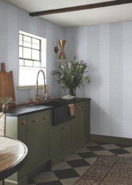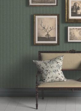 The structure of stripes meets the warmth of woven detailing in pattern Elkan Stripe. The pattern is inked in shades of pale green and beige against a forest green ground. Elkan Stripe is an unpasted, non woven wallpaper measuring 27 inches wide by 27 feet long, covering approximately 60.8 square feet per roll.