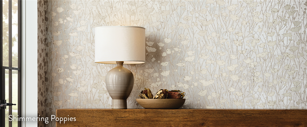 Dense clusters of petite poppies offer rich charm with their playful, abstracted styling. Seen here with cream and beige flowers with golden centers and pale blue greenery against a dappled grey backdrop. Poppy Trail is a prepasted, surestrip wallpaper measuring 20.5 inches wide by 33 feet long, covering approximately 56.4 square feet per roll.